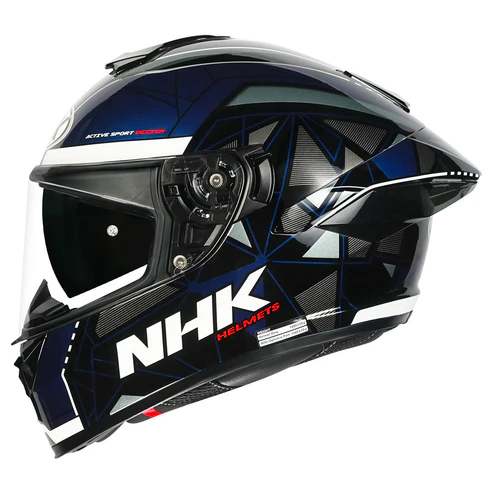 The NHK K5R Triangle Black Blue is built for riders who value dependable safety, comfort and a bold, geometric graphic design. Crafted using a durable yet lightweight thermo-polymer shell, this full-face helmet offers strong impact protection while remaining comfortable for long commutes and touring rides. Its aerodynamic profile helps reduce wind resistance, allowing for improved stability at higher speeds. The helmet features a dual-visor system, including a Pinlock-ready clear visor for enhanced clarity and an internal sun visor for quick adaptation to bright conditions. With a well-structured multi-ventilation system, the K5R Triangle ensures continuous airflow, helping riders stay cool throughout long hours on the road. The removable and washable comfort liner provides a secure and hygienic fit, while built-in speaker pockets allow seamless use of Bluetooth communication devices. Certified with ECE 22.06 and ISI standards, the Triangle Black Blue offers reliable protection paired with a striking black and blue graphic finish.